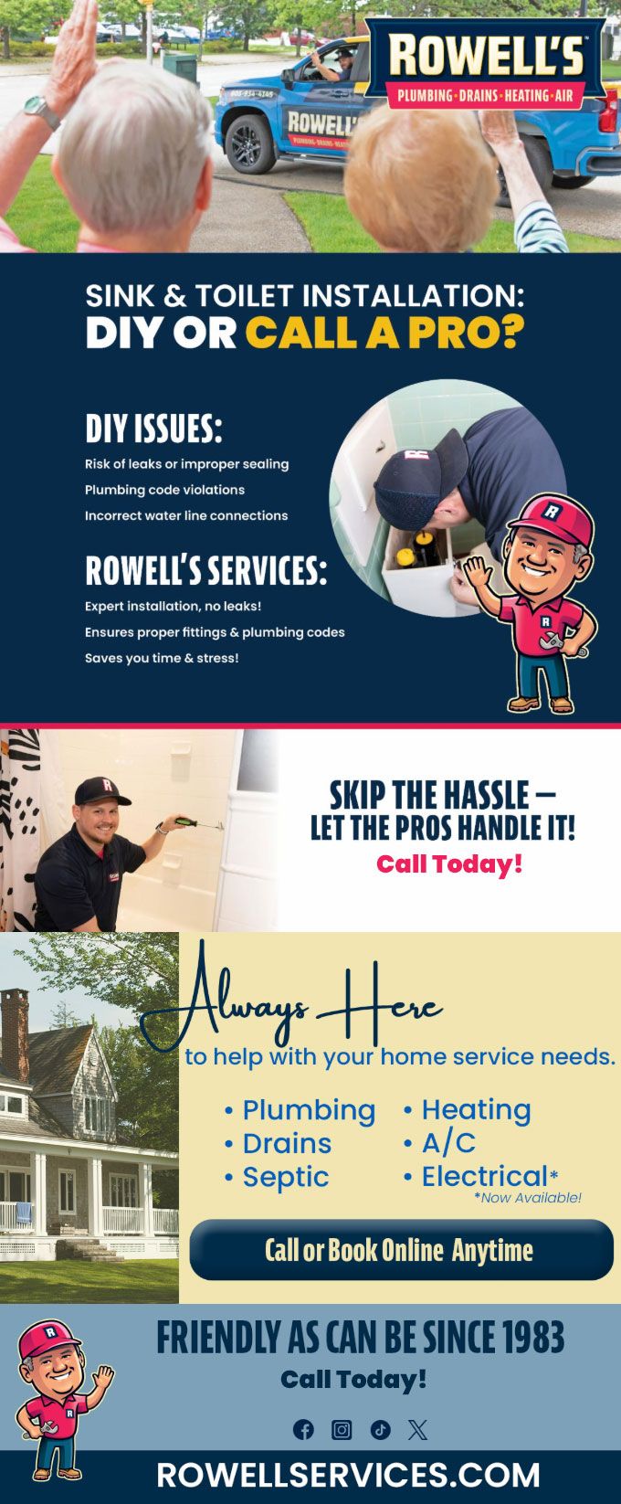 "Friendly As Can Be Since 1983!" When you need help with your plumbing, drains, heating, cooling or electrical in Loudon, you can always rely on Rowell's Services! Call us now or book online!